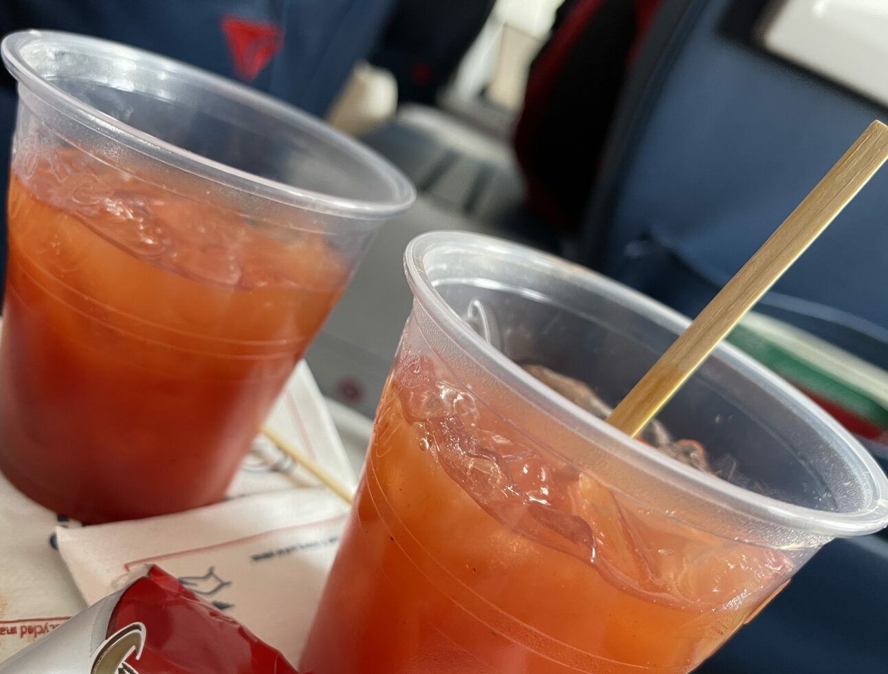 When you must fly during COVID, it may as well be to a semi tropical destination, in first class, and totally obliterated. Bloody Marys will do the trick.